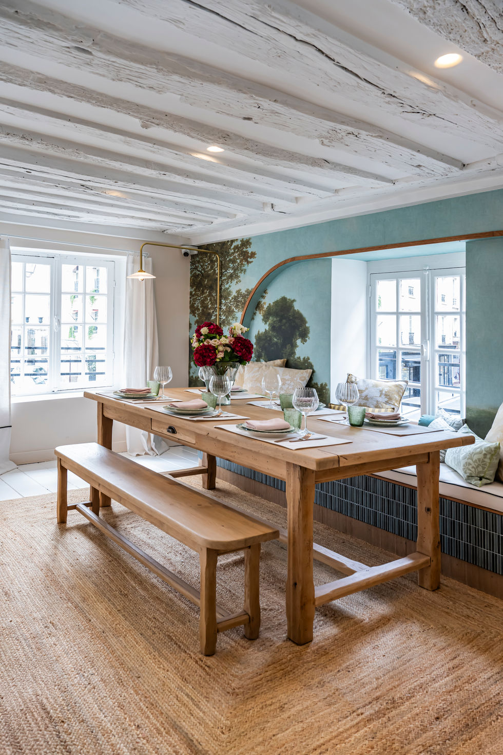La menuiserie sur mesure, des fenêtres aux bibliothèques intégrées, a été pensée comme une véritable écriture architecturale, alliant fonctionnalité et élégance. Les matières naturelles – bois patiné, pierre, laiton brossé – ainsi que le mobilier chiné créent un univers chaleureux, intemporel et contemporain, fidèle à l’ADN textile et émotionnel de la maison.